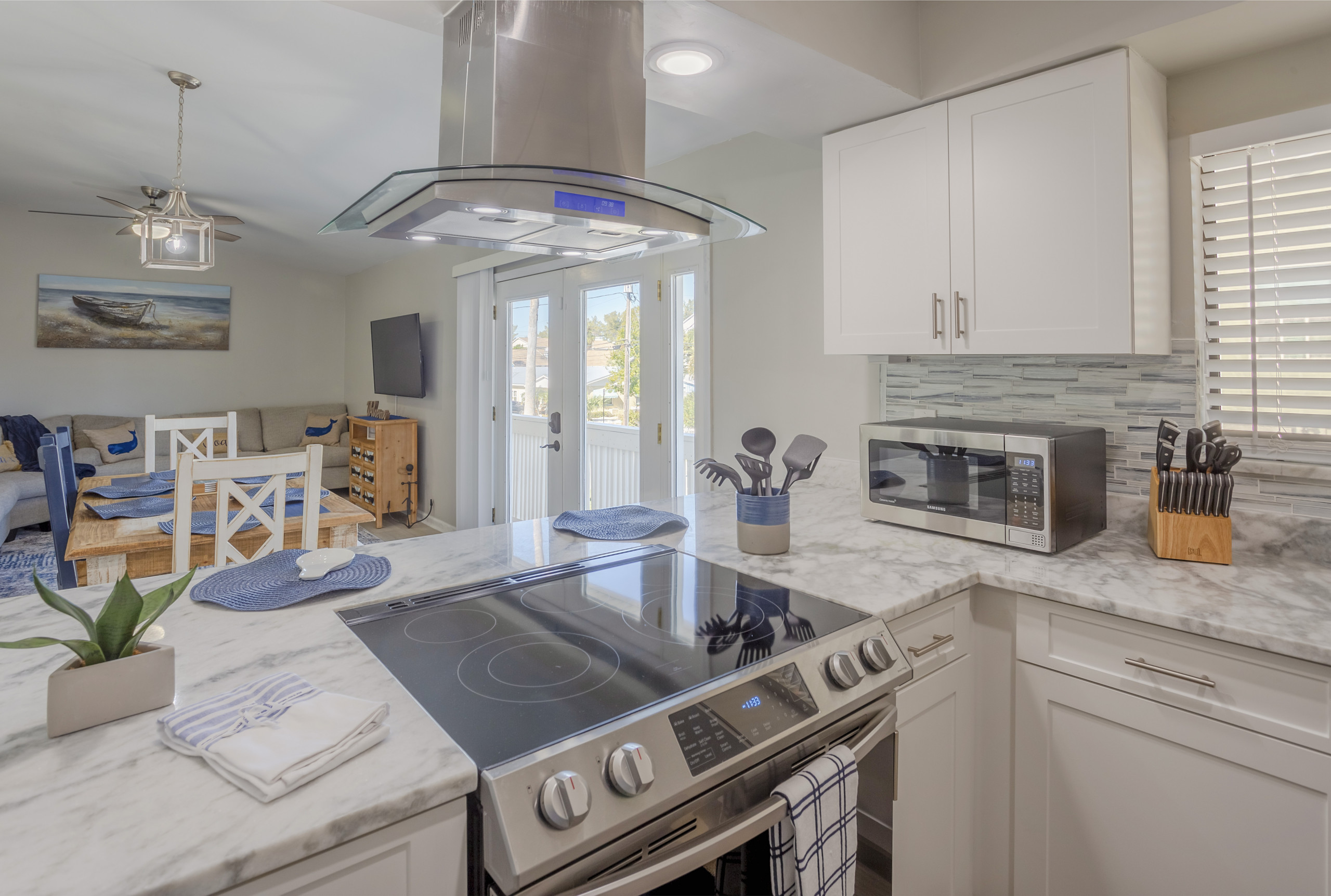 The living room features a large flat screen TV. WIFI info is located on the TV stand in the living room for your convenience.